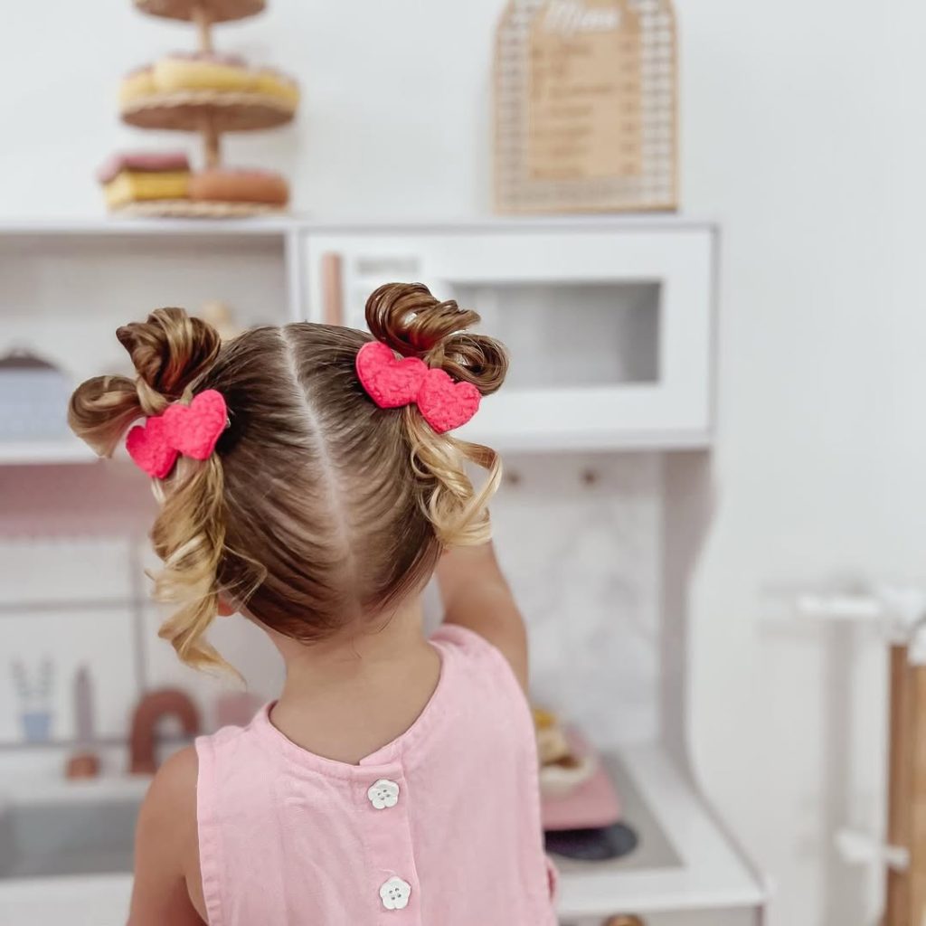 A straight center part leads to petite space buns; front tendrils are curled into candy-cane spirals. Bright heart bows deliver the pop of color kids adore.