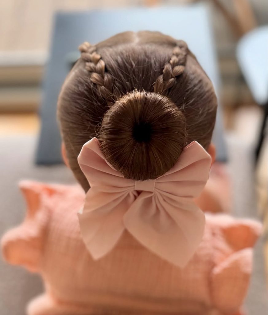 Two narrow braids track from the hairline toward the crown and feed into a sleek donut bun. A blush bow sits beneath the bun like a corsage—classic recital energy with holiday polish.