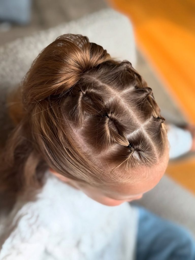 A row of tiny looped elastics marches down the center, creating a playful “mohawk” texture that feeds into a puffed half-up bow-bun. It looks intricate but is parent-proof with clear elastics.