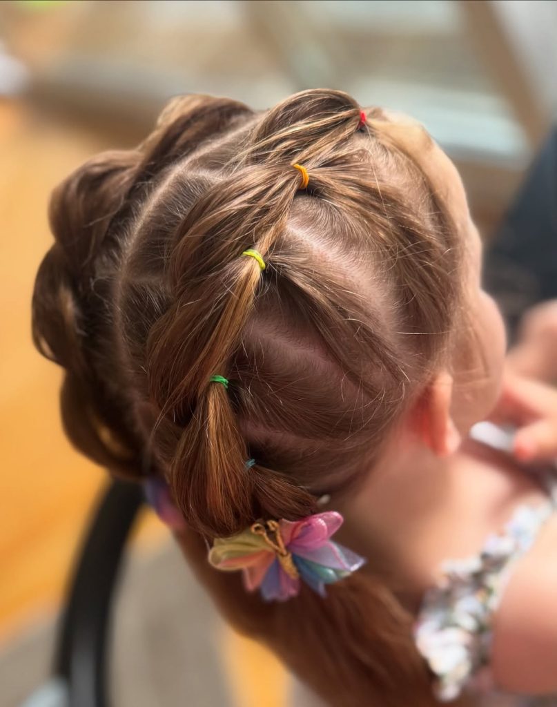 Diagonal micro-sections lead into a chunky center braid and end in a ponytail finished with iridescent butterfly bows. The rainbow elastics bring playful color without committing to ribbons.