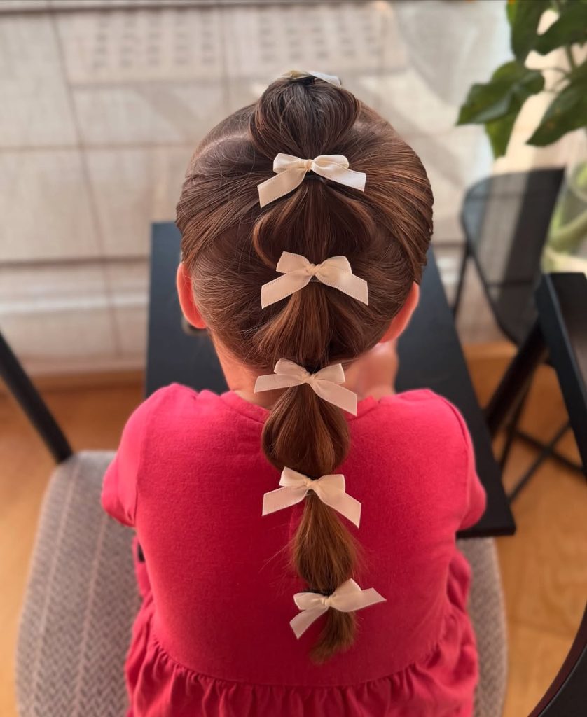 A sleek high pony is segmented into soft bubbles, each tied with a petite ivory bow. It’s equal parts modern and ballerina—beautiful with knit dresses or sparkly tights.