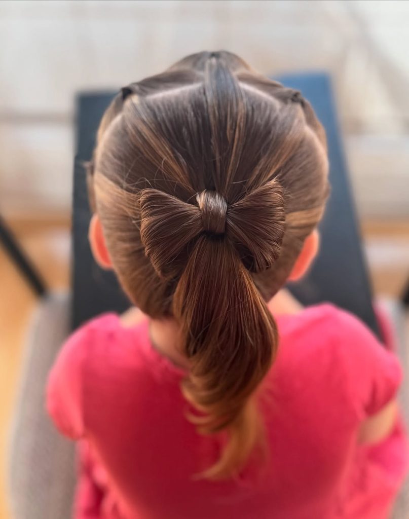 - Start with a mid-height pony. Split the tail, loop each half, then wrap a thin section around the center and pin under the bow.