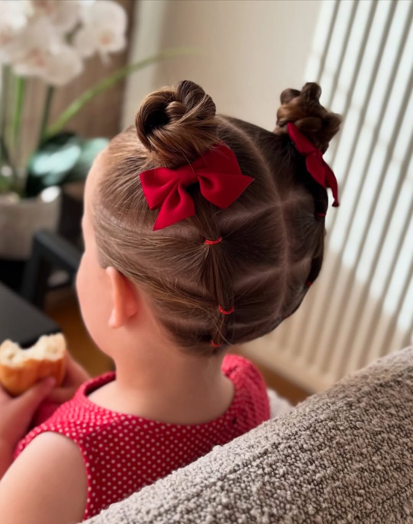 A neat center part feeds into two high buns; a slim elastic ladder anchors each section and keeps flyaways at bay. Red bows at the base give instant holiday sparkle without glitter.