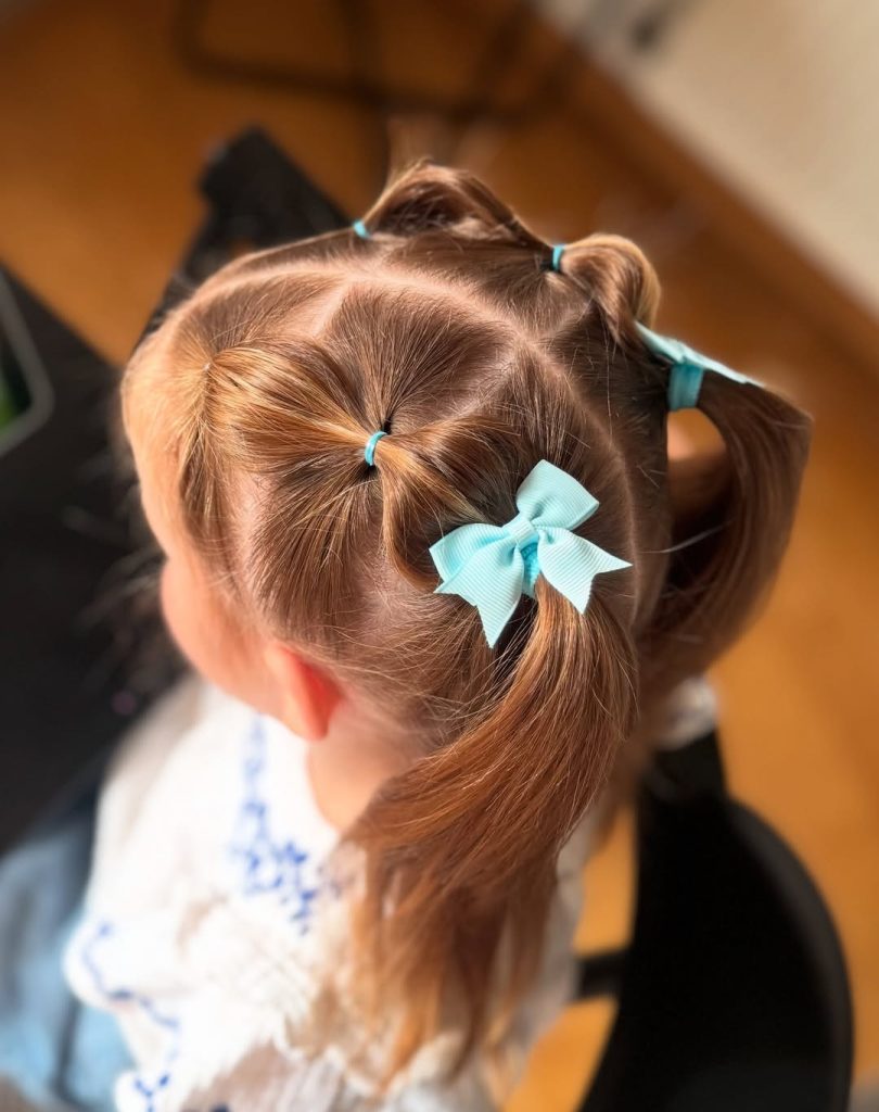 Three tiny stacked ponytails cascade into two low ponytails—think of it as a “tree” ladder that ends with oversized bows. The micro-ponies create a diamond texture that looks intricate but is surprisingly Easy once you section cleanly.