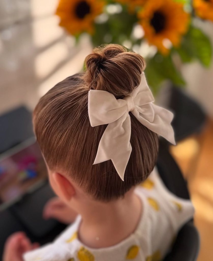 A smooth high bun sits perfectly centered and is crowned with an ivory bow—the definition of timeless. The hairline is sleek, the bun is compact, and the proportions flatter tiny profiles.