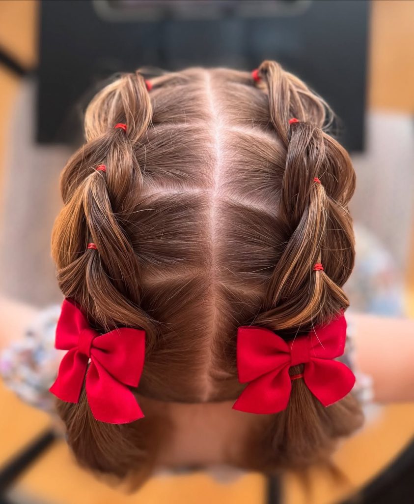 A clean center part divides the hair into two sections that are rope-twisted along the hairline and anchored into low pigtails. Tiny red elastics punctuate each twist, then oversized bows finish the look—cheery and Cute without going overboard.