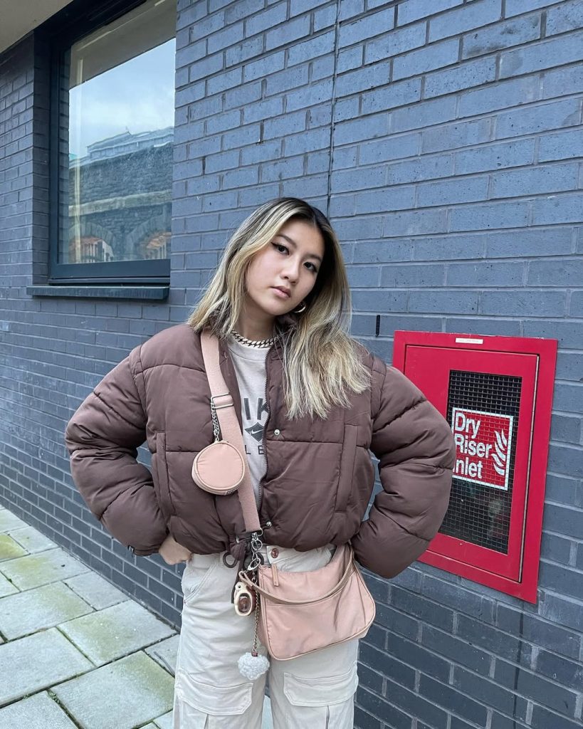 A cropped, cocoa puffer sits over a graphic sweatshirt and cream cargo pants, blending casual comfort with utilitarian street-style charm.