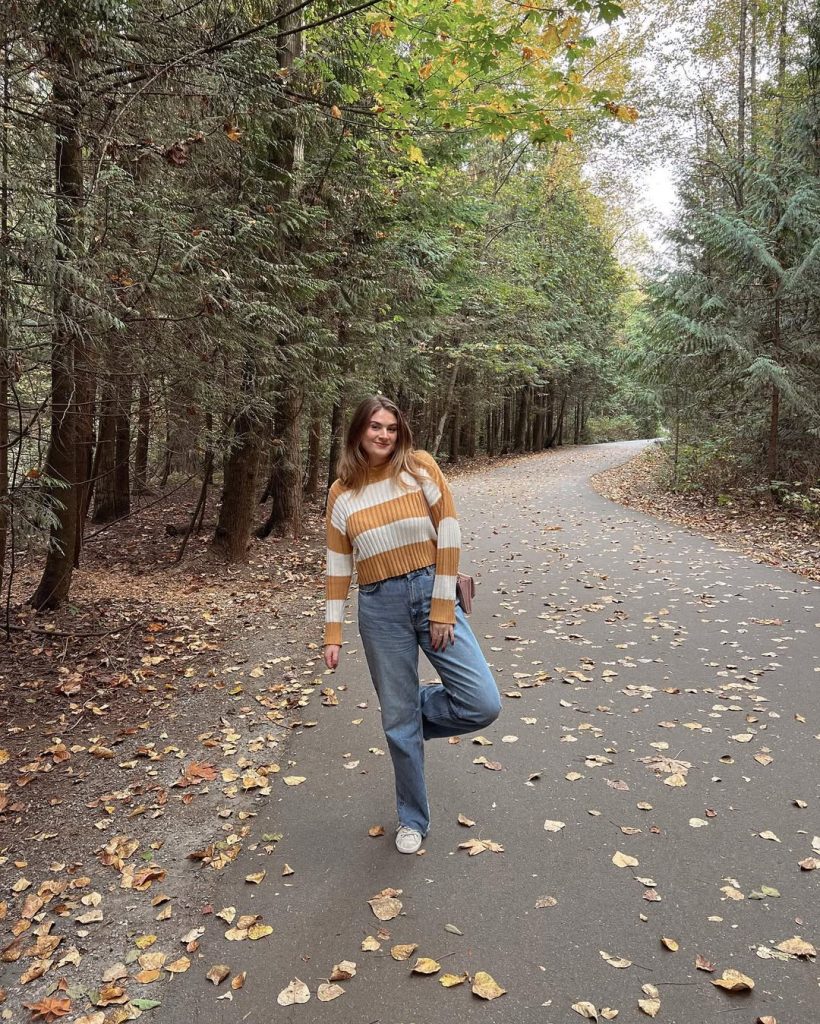 A mustard-and-cream striped sweater, casual jeans, and sneakers capture that in-between fall mood when the air is crisp but not yet icy.