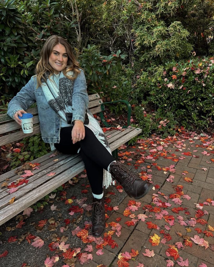 A classic denim jacket, oversized scarf, and lace-up boots create a cozy bench-side moment that feels equal parts coffee-date and park-stroll ready.