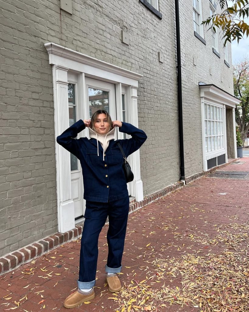 A dark indigo jacket-and-pants set, layered over a cream knit hoodie, nails the balance between workwear and relaxed street style.