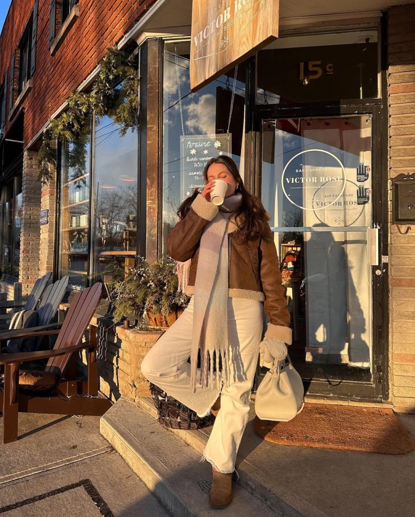 A brown shearling-lined jacket, creamy jeans, and a long scarf glow in golden-hour light, delivering effortless café-stop elegance.