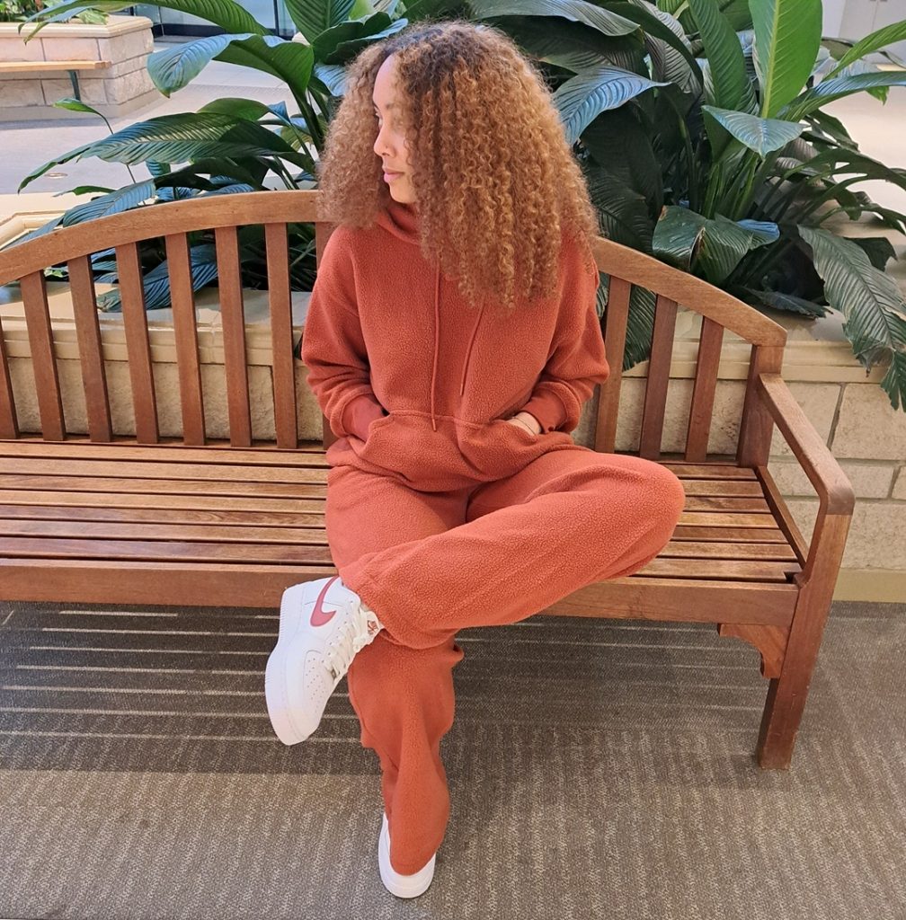 A rust-colored fleece hoodie and matching pants turn loungewear into a casual yet put-together uniform, especially with crisp sneakers.