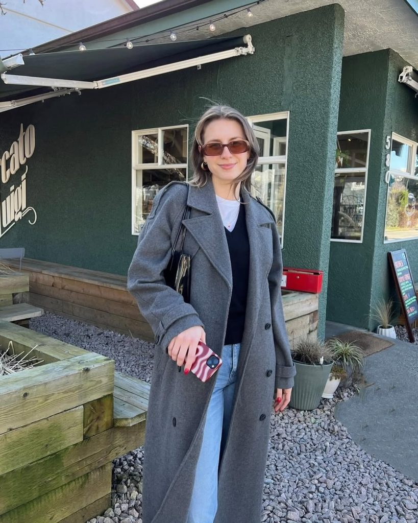 A long grey coat layered over denim and a simple knit delivers that effortless street-style energy that works from brunch to the work office.