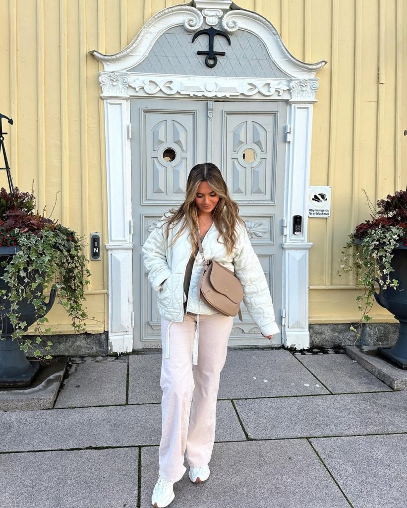 Quilted outerwear in soft white, paired with oatmeal pants and a neutral crossbody, creates a cloud-like winter look that still feels simple.