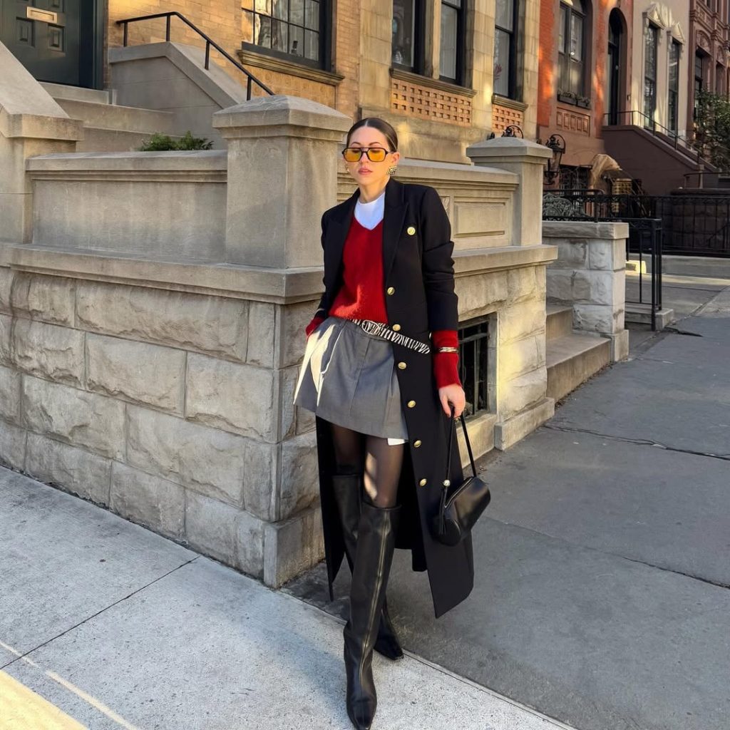 A long black coat with gold buttons, a red sweater, and a pleated mini skirt channel elevated schoolgirl energy with modern street-style polish.