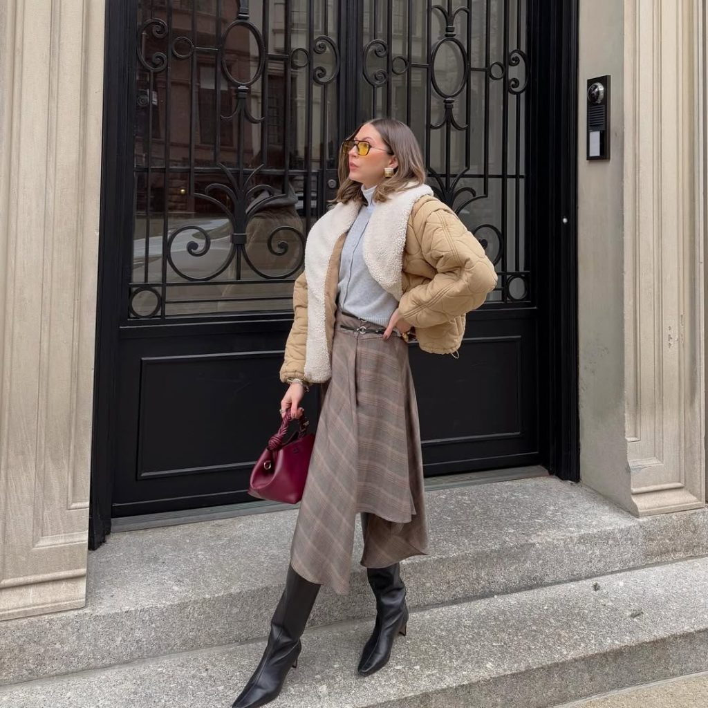 A sand-toned quilted jacket and plaid midi skirt create a soft, heritage-inspired outfit that feels both simple and quietly luxurious.