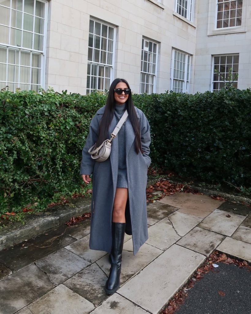 Head-to-toe grey—coat, knit, and mini dress—paired with tall boots offers a streamlined, trendy take on monochrome that’s surprisingly cute and practical.