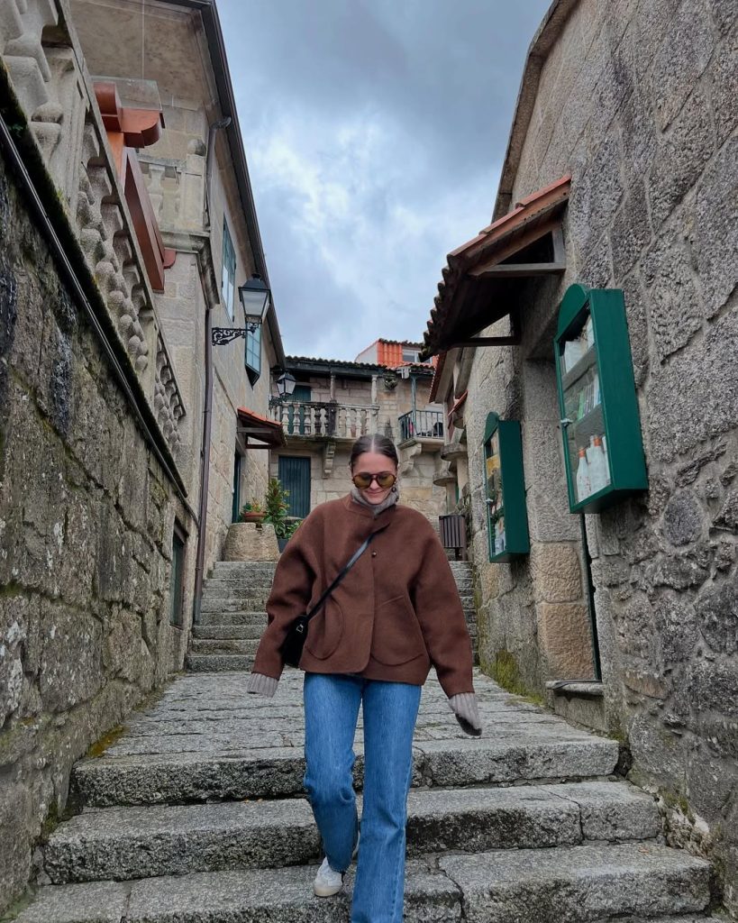 A cocoa wool jacket, straight jeans, and sneakers make this casual hillside look perfect for exploring old towns on cool fall or winter days.