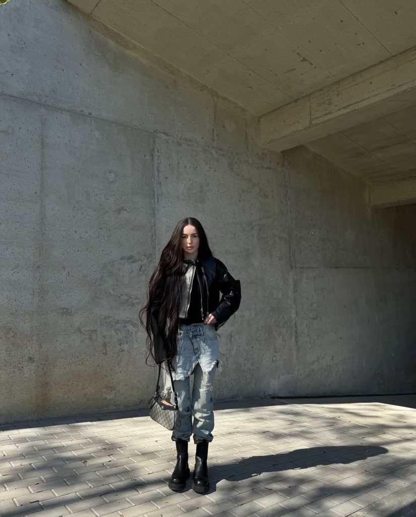Ripped loose-fit jeans, a cropped leather jacket, and heavy boots promote a powerful baddie and street-style attitude infused with a subtle Y2K attitude.