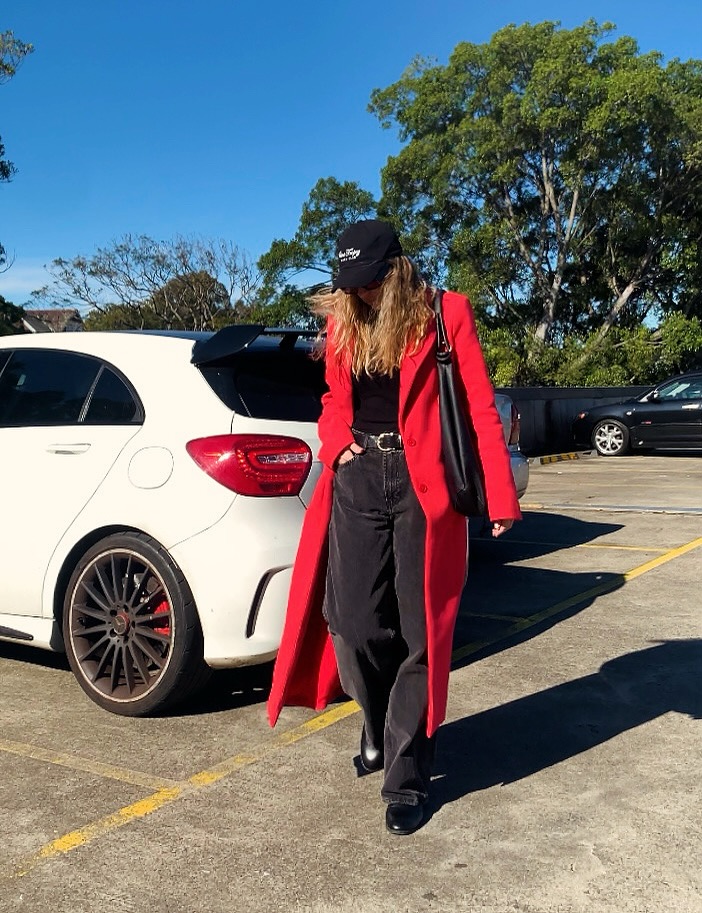 A fire-red coat thrown over all-black basics turns an ordinary lot into a trendy runway moment while still staying wonderfully simple.