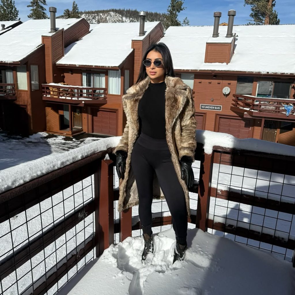 A long faux-fur coat over sleek black layers is pure cold-mountain glamour, proof that staying warm in freezing winter snow can still be adorable.