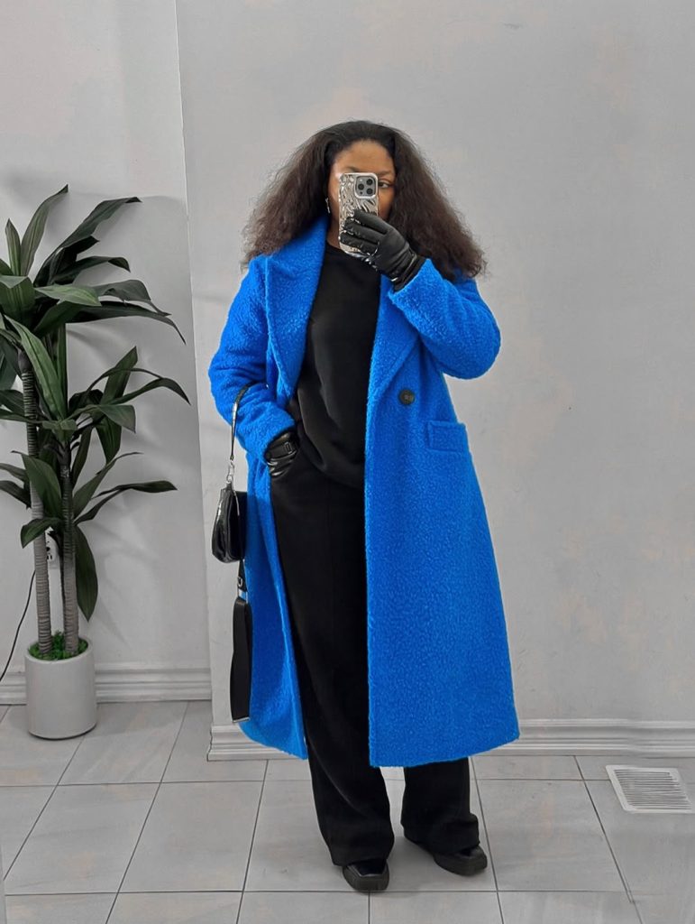 A vivid cobalt coat over an all-black base delivers powerful color-blocking, especially striking on Black women who love standout winter aesthetic moments.