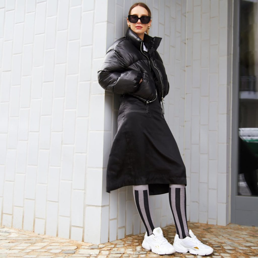 A glossy black puffer, midi skirt, and striped tights reimagine cold-weather street style, mixing sporty sneakers with sleek city drama.