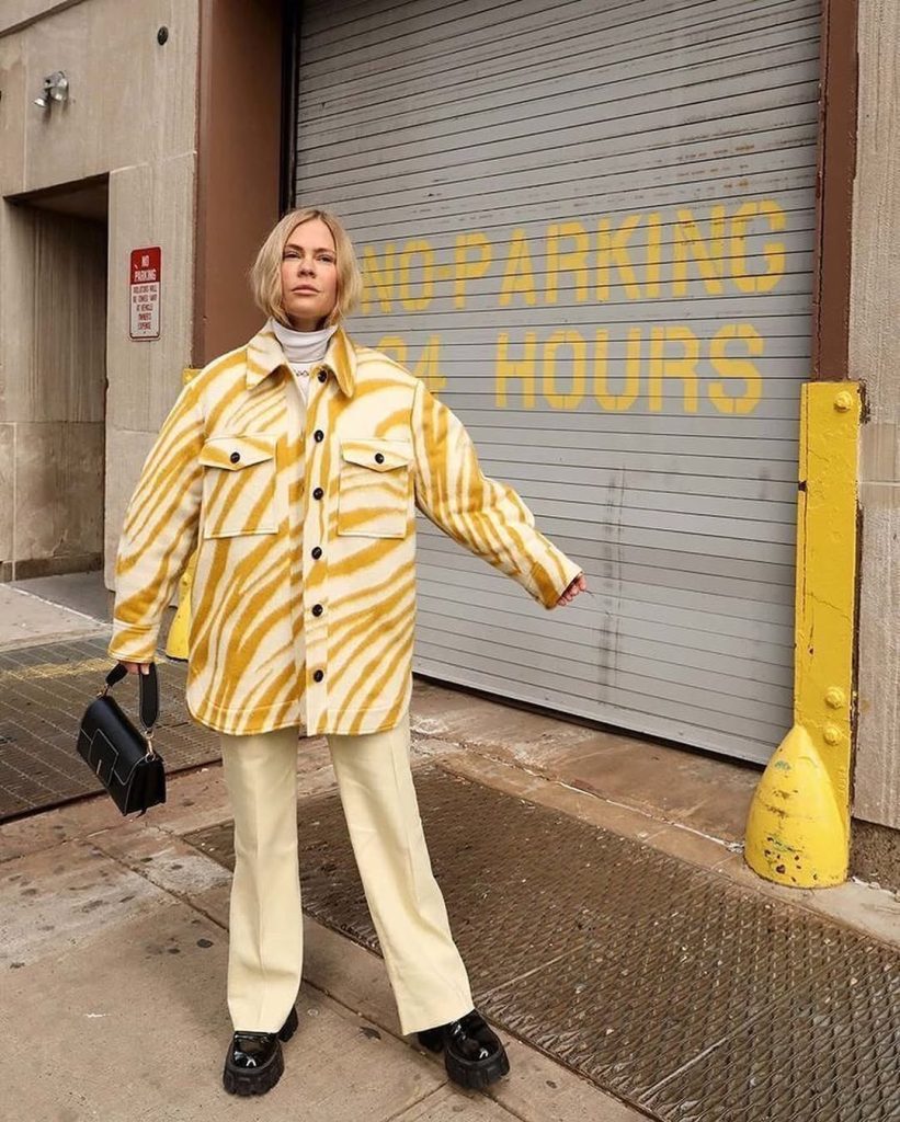 A sherpa-style zebra shacket in butter yellow turns a grey city day into a mini runway moment, paired with cream trousers and chunky loafers.