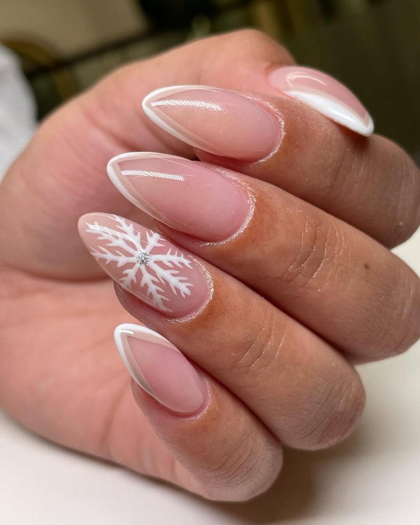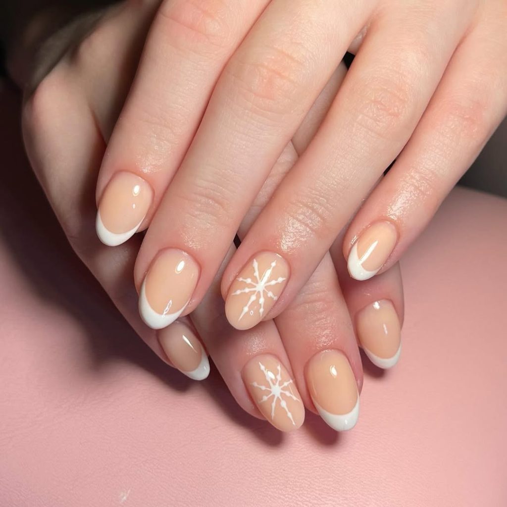 Soft, creamy White tips on Short almond nails with a single snowflake accent—quiet festive at its best. It’s the manicure equivalent of a cashmere beanie: cozy, flattering, and endlessly matchable.