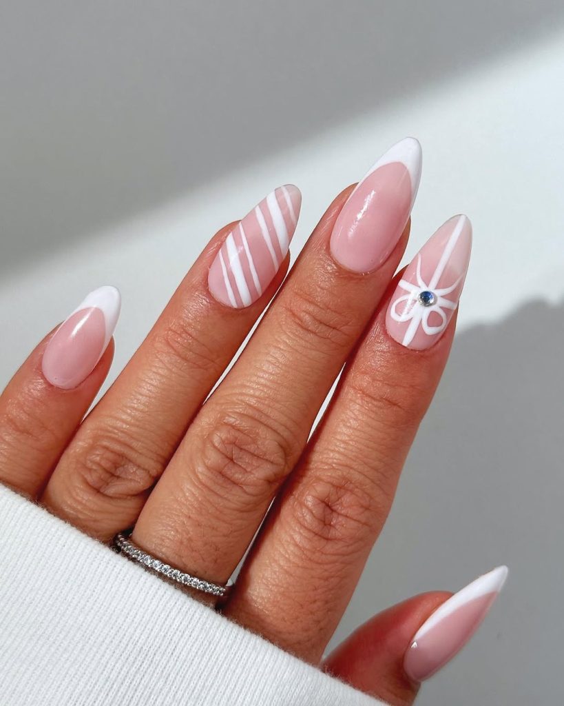 Classic micro-French meets present-topper art: thin white edges on elongated Almond nails, candy-stripe detailing on one finger, and a tiny sculpted Bow (with a gem “knot”) on another. It’s playful, polished, and wonderfully Simple in palette—just White on blush-pink.