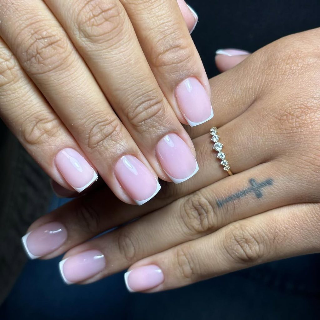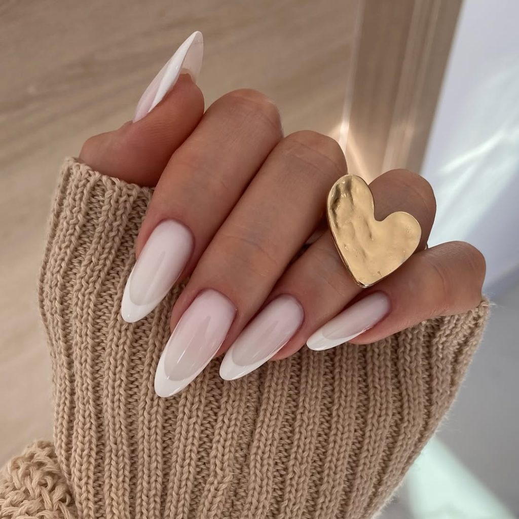 Salon ask: “Milky neutral base, crisp White French, Almond shape, glass-shine top coat.”
