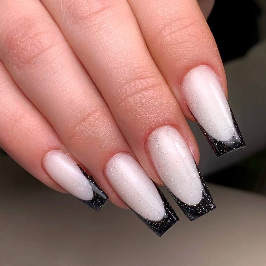 A snowfall shimmer base meets midnight-sparkle tips on elongated coffin nails. The squared-off ends make the dark edge feel architectural rather than heavy—elegant Long glam that still reads Simple thanks to the minimalist palette.
