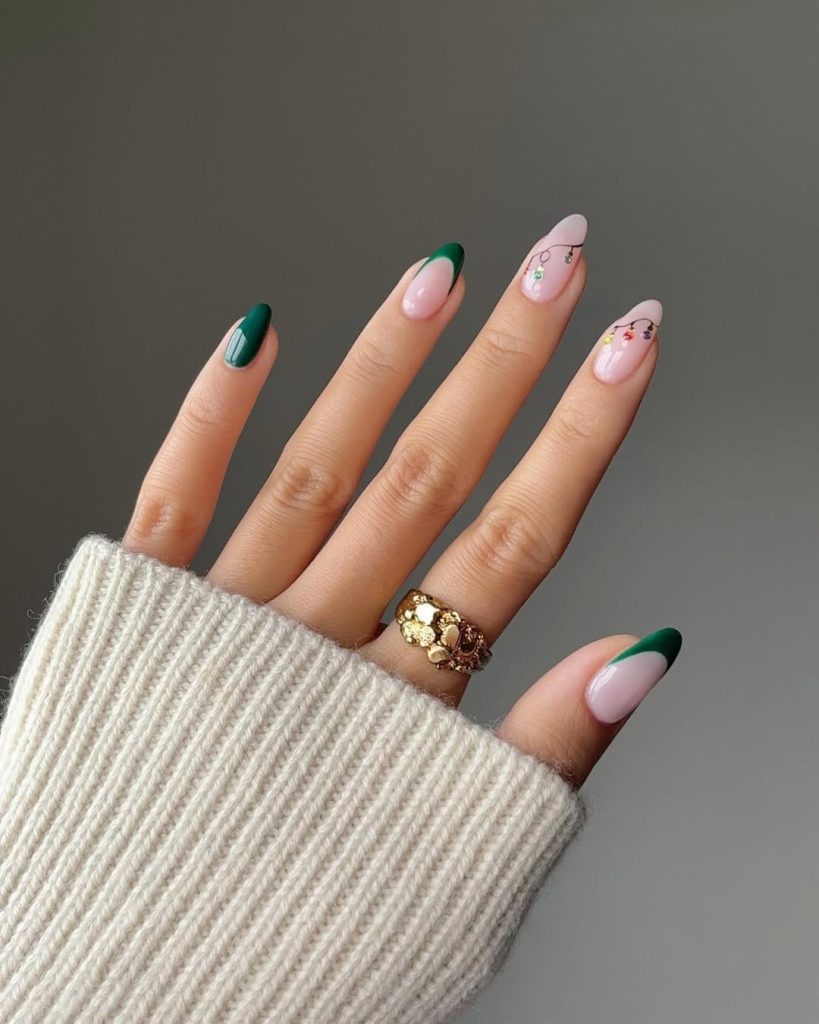 A crisp Green French on tapered Almond nails, with two accent fingers “strung” with tiny festive bulbs. The color story nods to Red and green without veering costume—editorial and cheerful in equal measure.