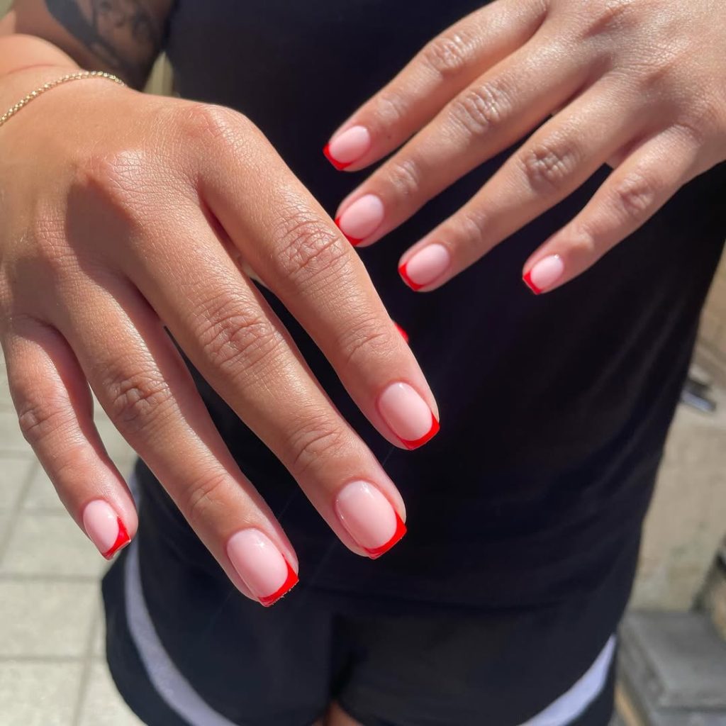 Glossy blush base with razor-clean Red tips—a bright, happy French that flatters Short lengths and all skin tones. If you love a classic sweater-and-jeans outfit, this is your pop of color.