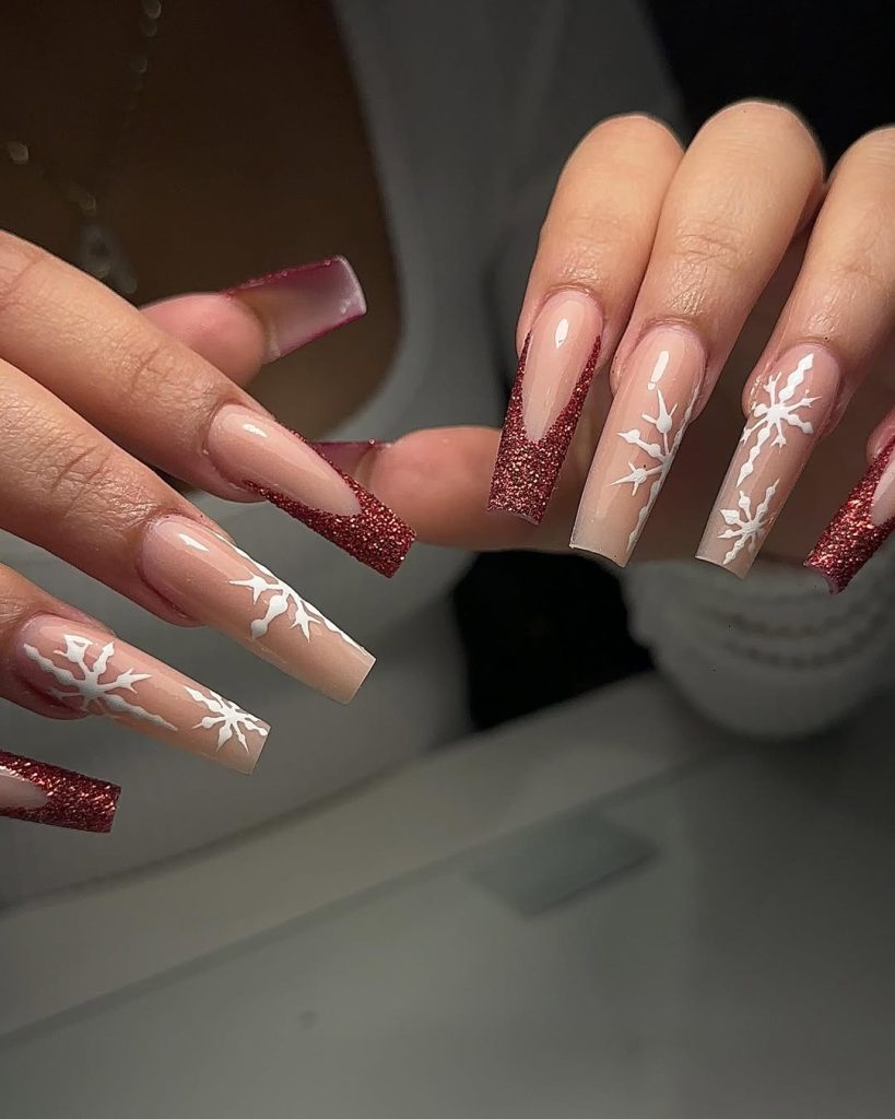 A deep, sparkling Red tip over a neutral bed on extra- Long coffin nails, paired with white, frosty branch motifs. The look is luxe and elongating—perfect if you’re dressing up for a gala or New Year’s cocktails.