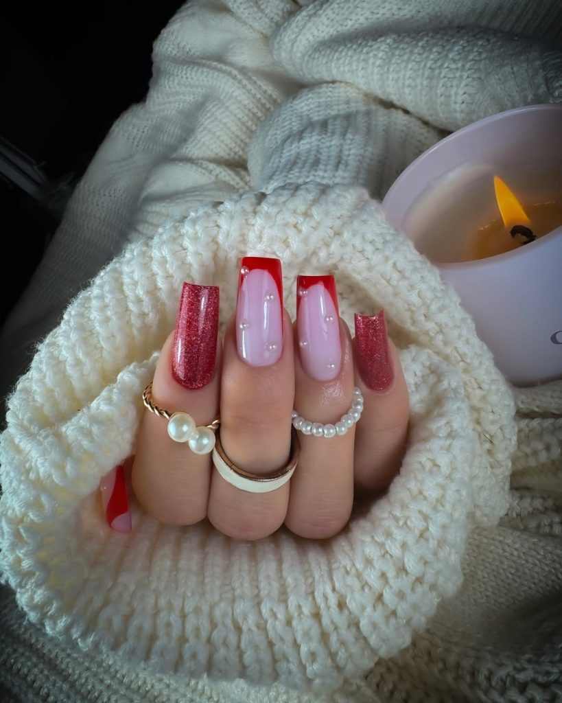 A high-shine mix that reads cozy-luxe: two ruby glitter nails flanking glossy Square nails with crisp Red French tips over a milky Pink base. The balance of sparkle and structure feels celebratory without sacrificing polish—ideal if your winter wardrobe is chunky knits and tailored coats. Length leans Long , but the straight sides keep it practical.