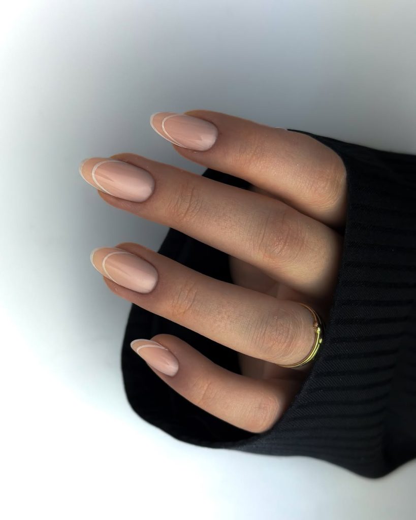 Salon ask: “Sheer nude base, ultra-thin brown micro-French, keep the length Short with gently rounded edges.”
