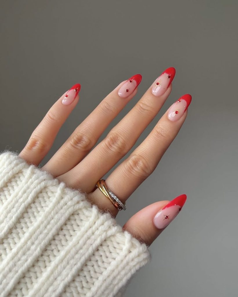 Classic Red tips meet tiny gem “berries” and starbursts placed along the nail beds—subtle twinkle that nods to Red and green styling without literally painting leaves. The softly tapered Almond shape keeps it feminine and day-to-night friendly.