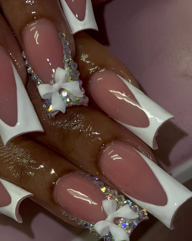 High-drama holiday glam: sculpted V White French tips traced with rhinestones and topped with petite 3D Bow accents on feature nails. The elongated coffin silhouette and sheer Pink base make the stones read couture rather than costume—think winter gala, not craft table. Definitely Long , definitely extra, and definitely fun for 2025 .