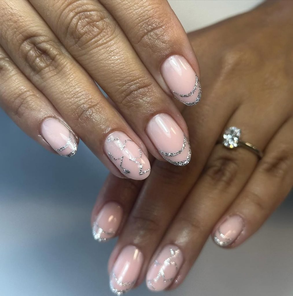 Salon ask: “Sheer blush base, ultra-thin silver glitter French with a couple of abstract tinsel squiggles. Keep the nails Short and slightly Almond .”