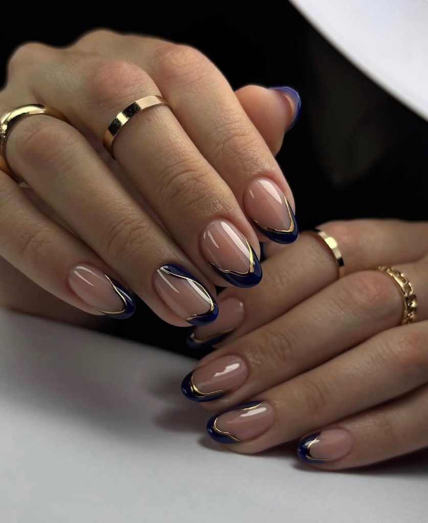 Salon ask: “Neutral jelly base, midnight Blue French with a thin gold outline, Almond shape.”