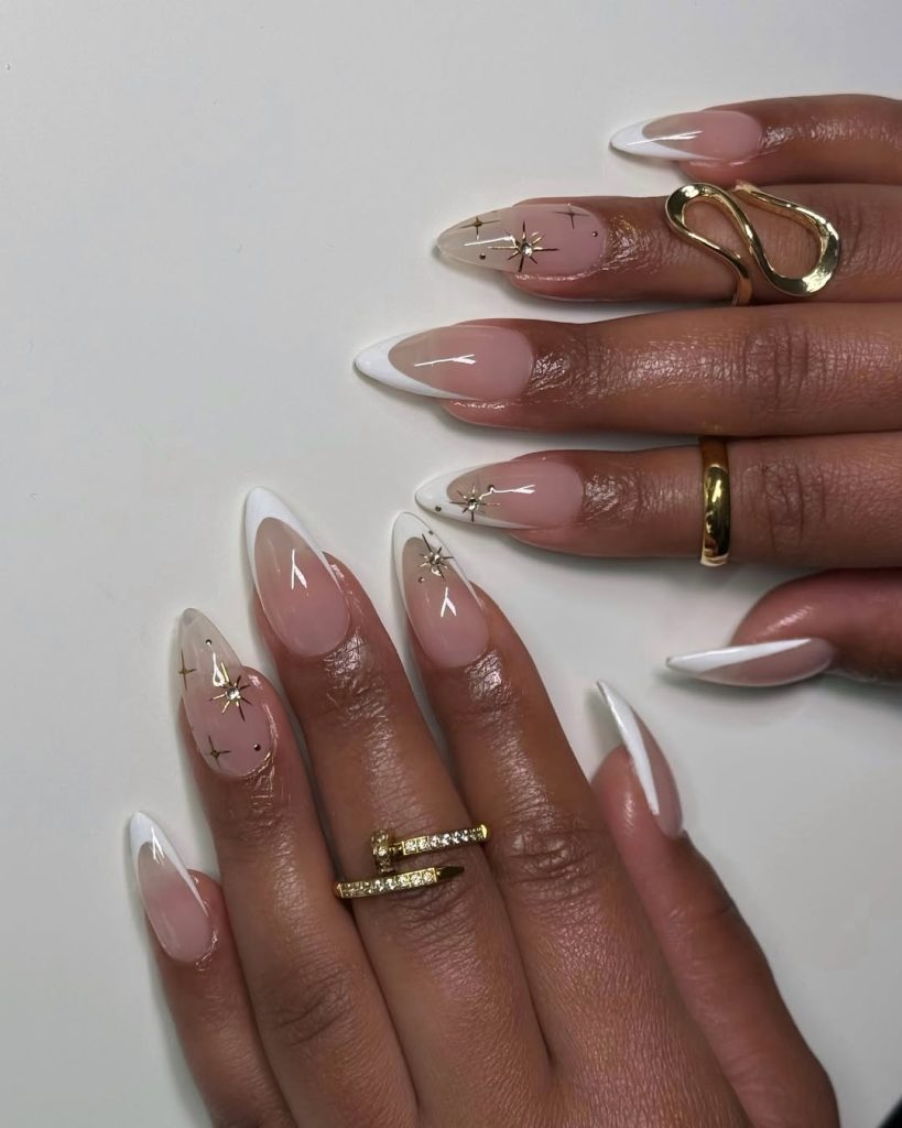 An elongated Almond -to-stiletto silhouette with crisp White diagonally tilted tips—subtle, but undeniably Long and glamorous. Tiny gold starbursts float over the nail beds like a clear December sky.