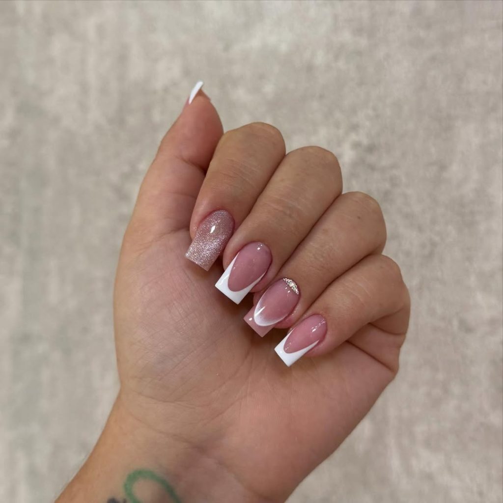 Salon ask: “Neutral base, classic White French with one Pink glitter accent and a couple of subtle V-French nails. Keep the shape Square .”
