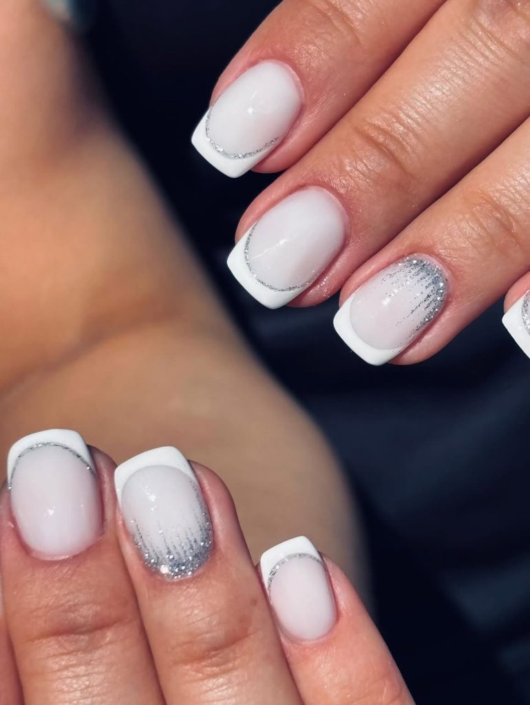 23) Frosted ombré French with silver shimmer
