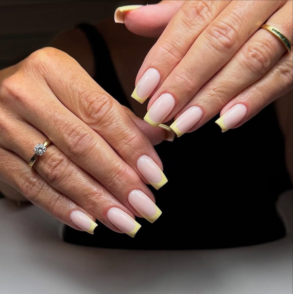 Salon ask: “Translucent nude, pastel yellow French, Square and Long —polished edges, no harsh outline.”