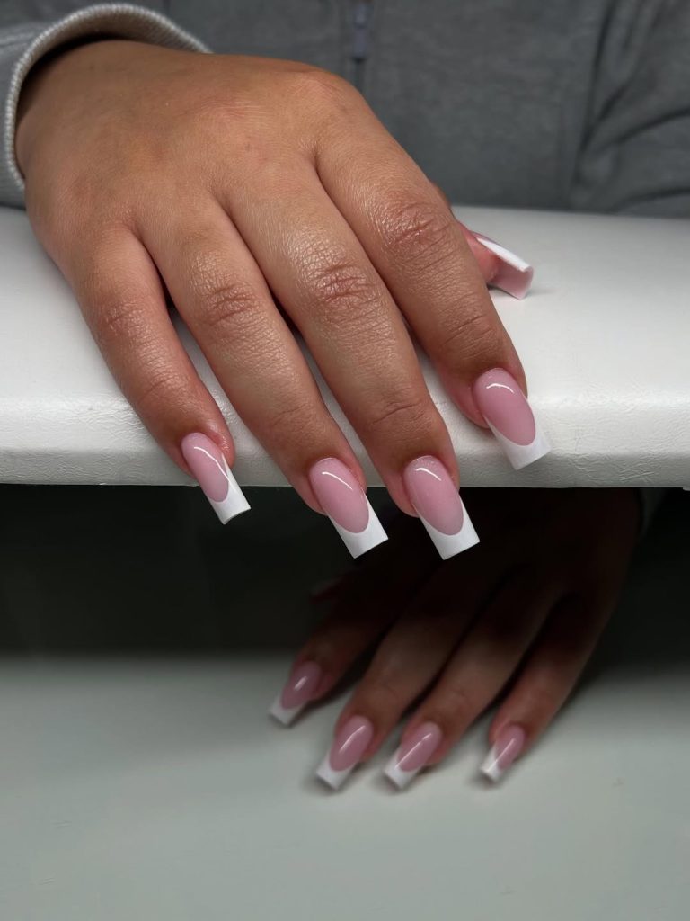 Salon ask: “Cool pink builder base, solid White French, tapered coffin with squared tips. Keep the length Long.”