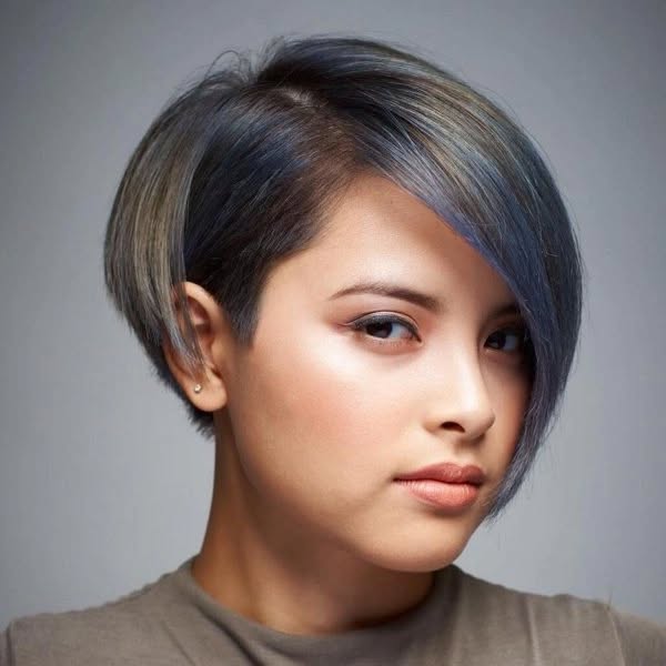 This angled bob proves that short hair can be incredibly flattering on round faces when the shape is done right. The length subtly extends past the jawline, while the diagonal cut creates a slimming visual line across the face.