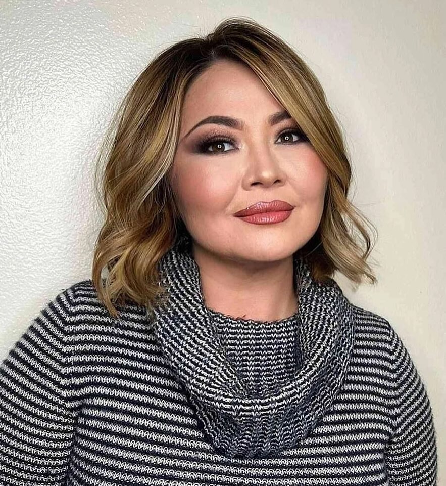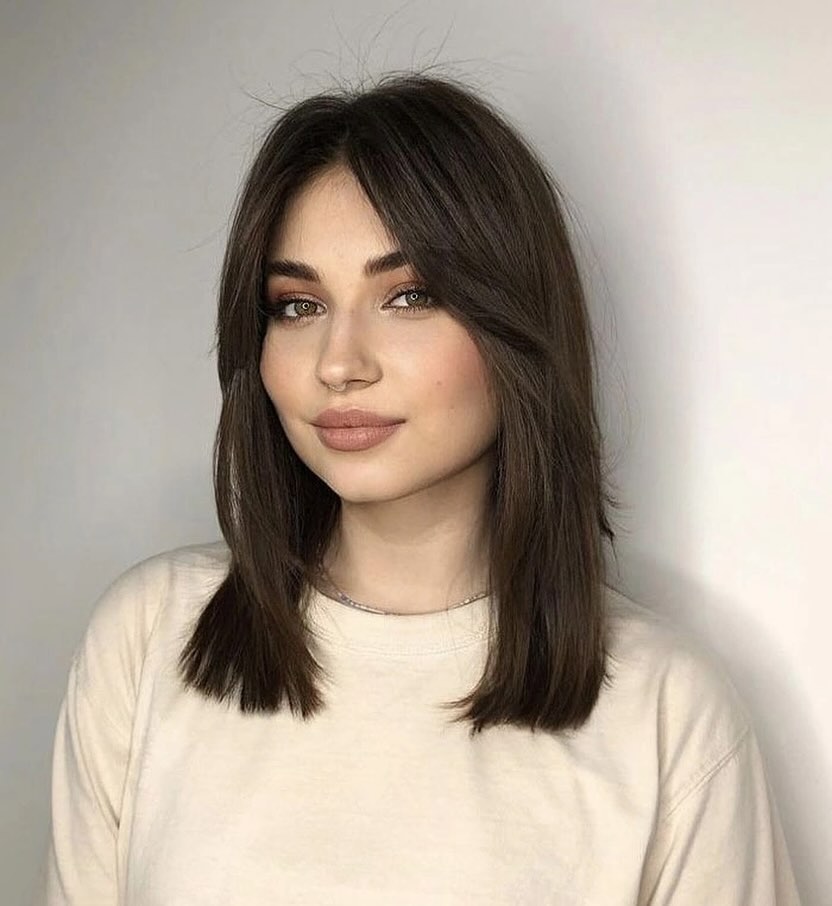 Here, medium-length hair with layers and bangs takes on a more relaxed, natural feel. The feathered layers reduce bulk at the sides of the face, helping create a slimming effect, while the softly parted bangs blend seamlessly into the rest of the cut.
