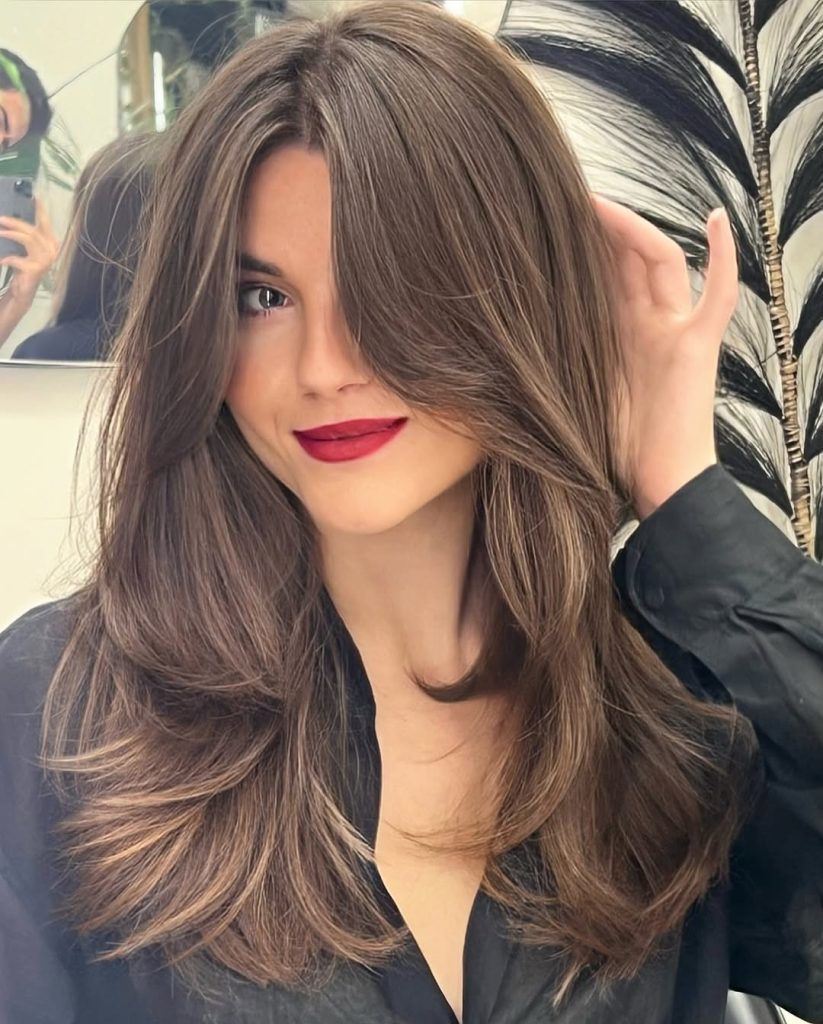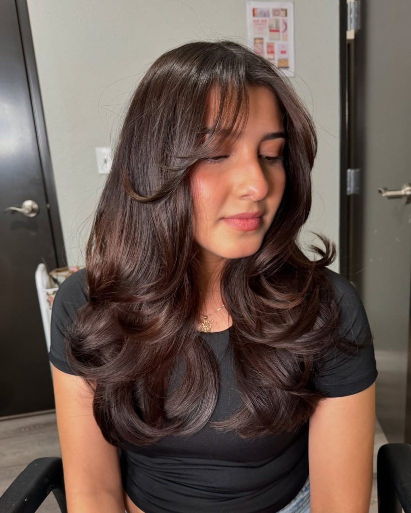 It’s a popular salon request among women who want drama without heaviness. Stylists often recommend this shape for those with thicker hair, as the layering keeps everything light and wearable without sacrificing length.