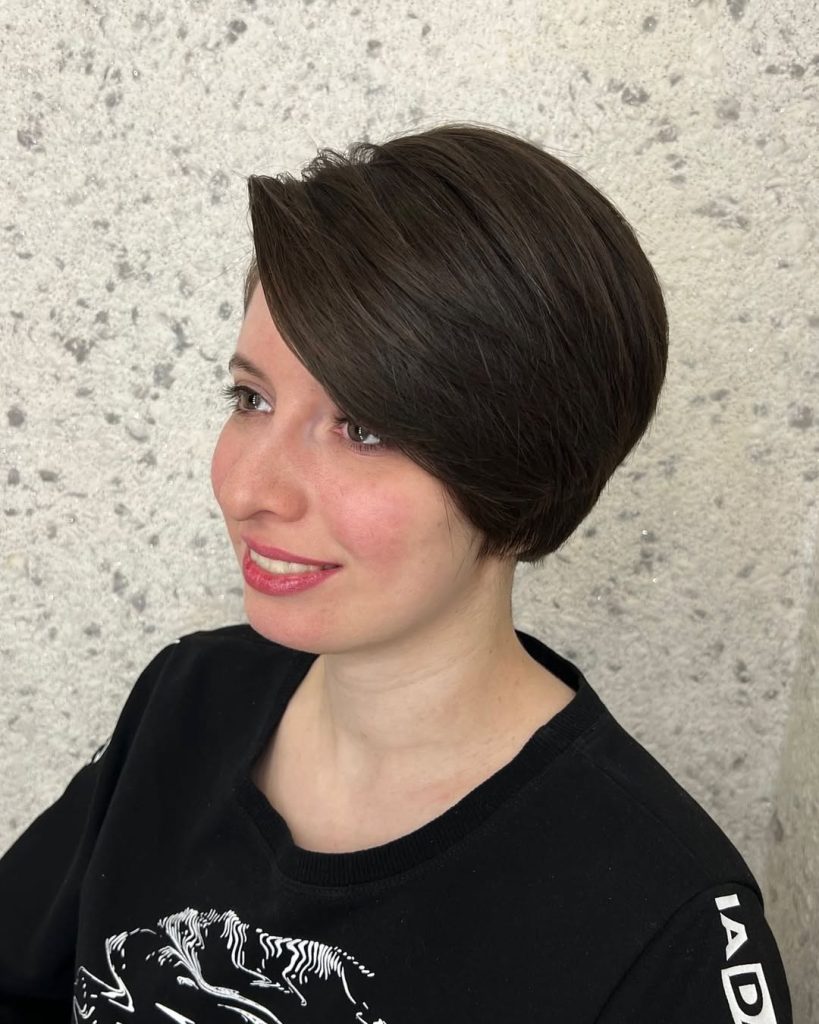 This pixie cut is all about strategic structure. The longer top and side-swept styling draw the eye diagonally, creating length where round faces need it most. Kept close at the sides and back, the shape feels intentional and refined rather than overly cropped.